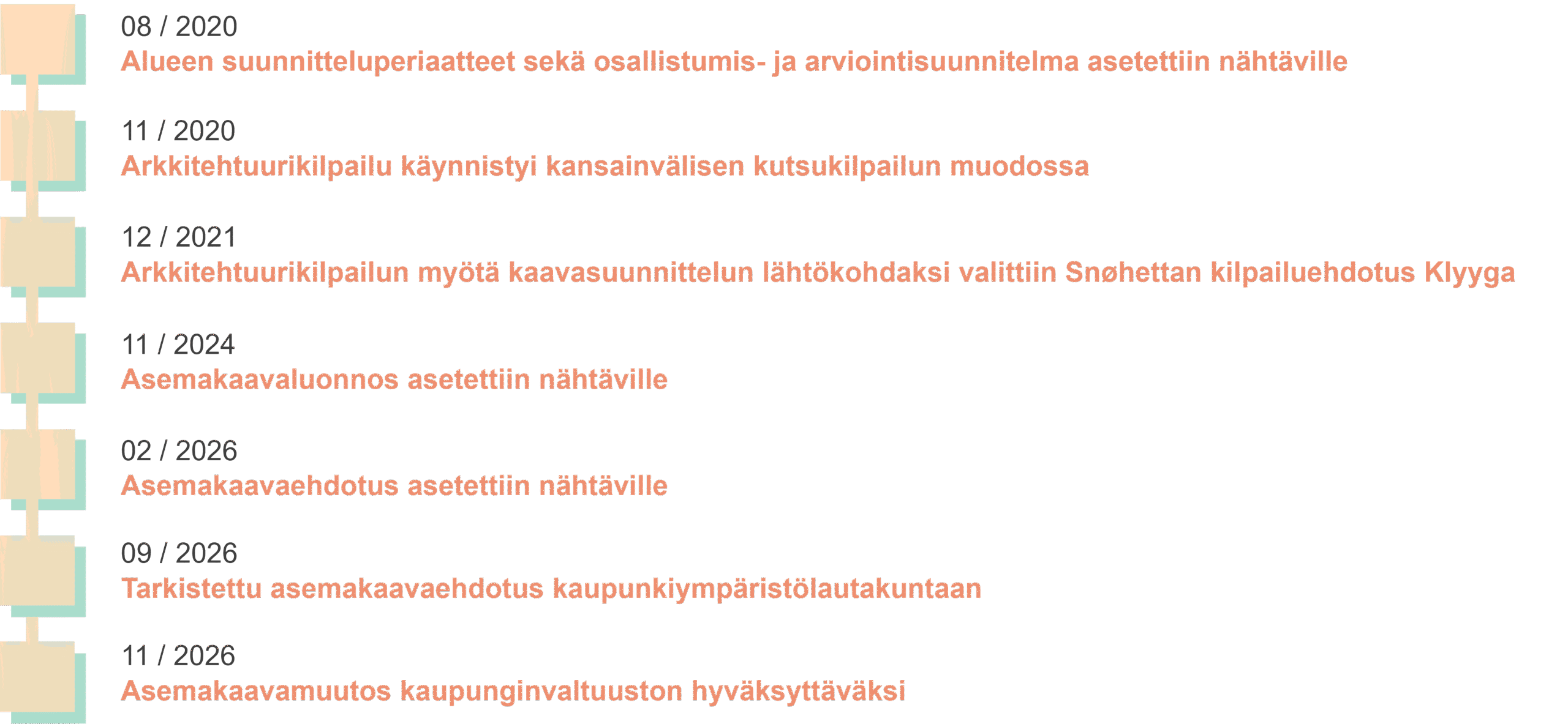 Alueen asemakaavaehdotus päätettiin asettaa nähtäville kaupunkiympäristölautakunnan toimesta helmikuussa 2026. Tavoitteena on saattaa hankkeen mahdollistava asemakaavan muutos kaupunginvaltuuston hyväksyttäväksi loppuvuodesta 2026. Hankkeen etenemistä ja suunnitteluun osallistumisen askelmerkkejä voi seurata tällä sivustolla.